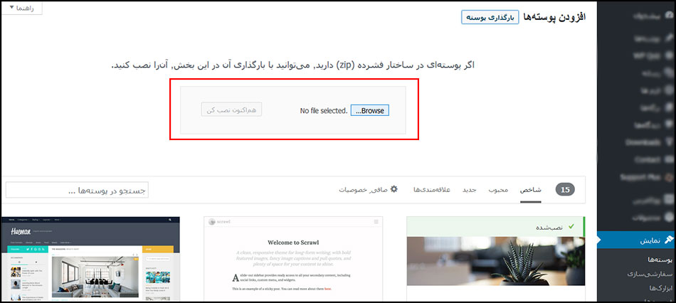 برای نصب قالب یا همان پوسته در وردپرس میتوانیم با کلیک روی “…Browse” و انتخاب قالب روی گزینه “Choose file” کلیک کنید تا قالب بارگذاری شود.