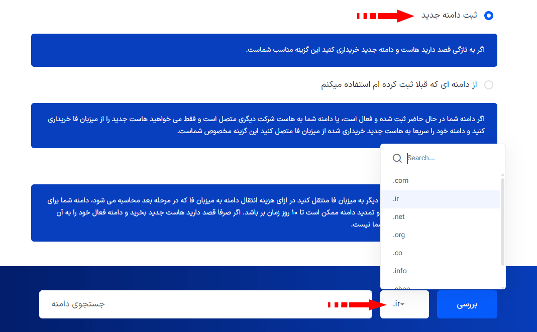 برای استفاده از این طرح ویژه تنها کافیست به صفحه هاست اشتراکی میزبان فا مراجعه کرده و پلن مینی اشتراکی در گروه هاست ایران را با کلیک بر روی گزینه “خرید این پلن و تحویل آنی” انتخاب نمایید. در صفحه بعدی مطابق تصویر زیر گزینه “ثبت دامنه جدید” را انتخاب کرده و نوع دامنه را بر روی ir تنظیم کنید. سپس در فیلد جستجوی دامنه، نام مورد نظرتان را جستجو کنید.