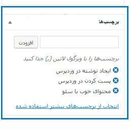 در محیط ویرایشگر وردپرس، جایی که یک نوشته به سایتمون اضافه میکنیم، شما می توانید برای نوشته ی خود برچسب هایی را در سمت چپ وارد کنید. برچسب ها کلماتی هستند که با متن و محتوای شما ارتباط دارند و می توان گفت پر کاربردترین کلمات و یا نیمه عبارات در متن شما را شامل خواهند شد.