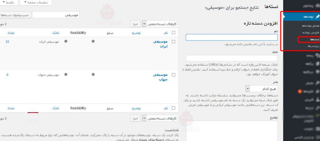 برای مدیریت و ایجاد دسته ها از منوی نوشتهها >> دستهها مراجعه میکنیم.