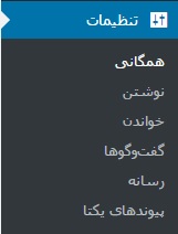 خیلی سریع میریم سر اصل مطلب، بخش تنظیمات در وردپرس دارای چندین زیر مجموعه میباشد که از تصویر زیر میتوانید مشاهده کنید. (البته بعدها با نصب افزونه های بیشتر ممکن این بخش زیرمجموعههای بیشتری داشته باشه اما پیشفرض همین گزینه ها در وردپرس وجود دارد.)