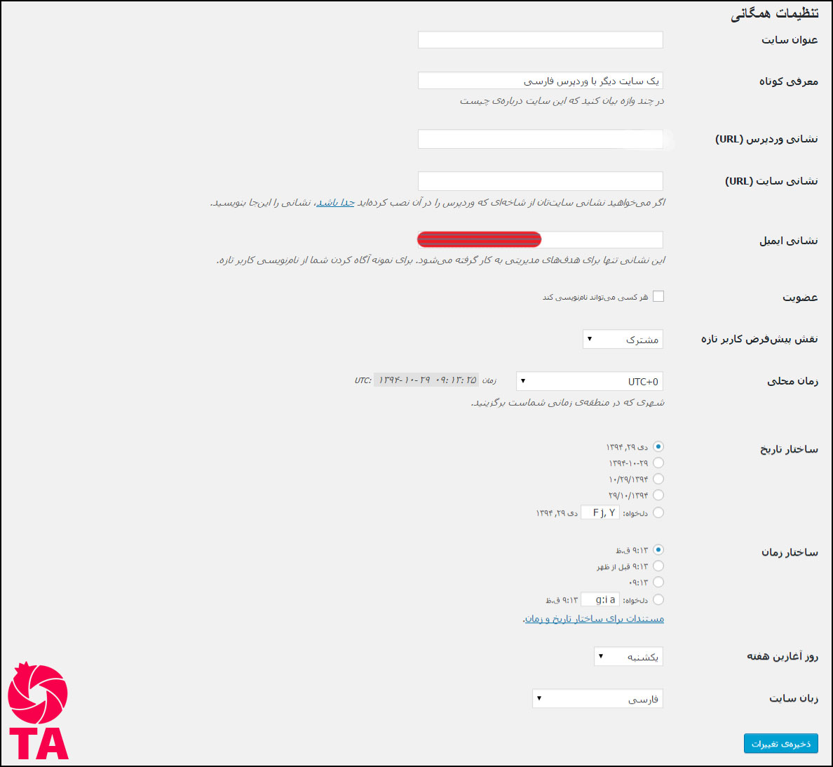 پس از بخش همگانی علاوه بر تقویم و تاریخ و نقش کاربر تازه، میتوانید عنوان سایت و معرفی کوتاه سایت را تغییر دهید، آدرس ایمیل مدیر کل سایت نیز، از همین بخش قابل تغییر و شخصی سازی است.