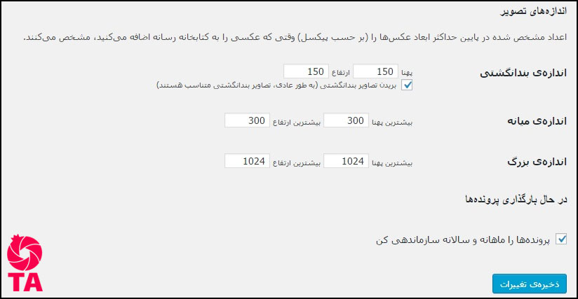 تنظیمات بخش رسانه مربوط به پرونده های چند رسانه ای (عکسها، فیلمها و..) در وردپرس است. همچنین می توانید اندازه ای برای تصاویر شاخص تعیین کنید تا در همه جا با همان اندازه نمایش داده شوند. بهتر است اگر اطلاعی ندارید این بخش را ویرایش نکنید و بگذارید تنظیمات پیشفرض باقی بماند.
