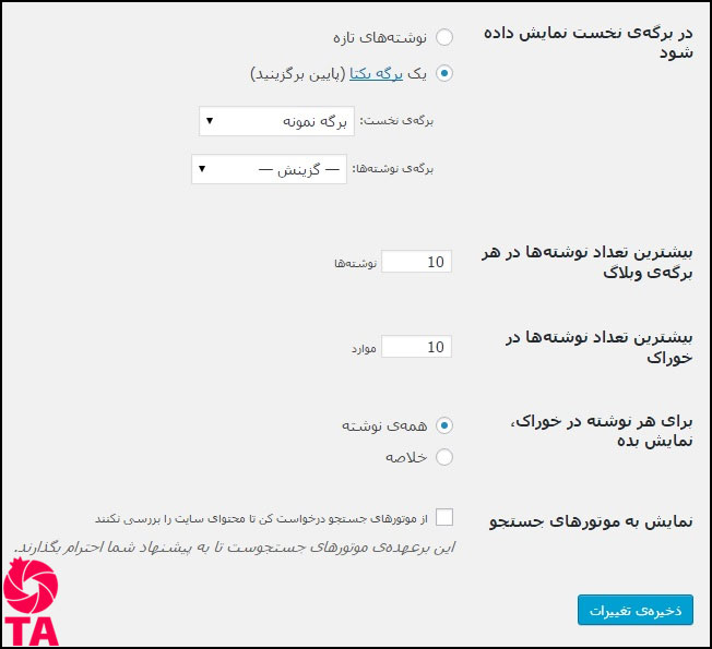 تنظیمات خواندن مربوط به تنظیم صفحه نخست و وبلاگ و تعداد نوشته های درون سایت است.
