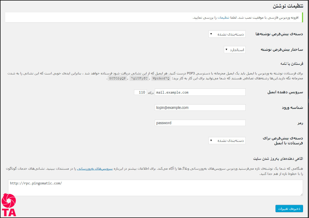 تنظیمات نوشتن در وردپرس هم مربوط به تنظیماتی می شود که نوشته خود را از طریق ایمیل به وردپرس ارسال کنید تا در سایت شما منتشر شود.
