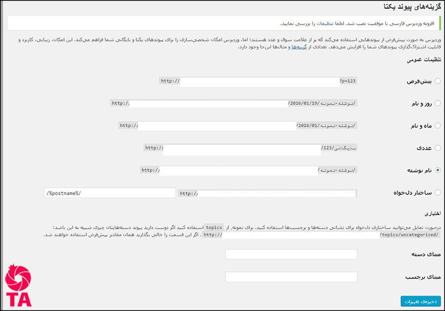 تنظیمات پیوندهای یکتا در وردپرس از اهمیتی بالایی برخوردار است. به تصویر زیر نگاه کنید تا در ادامه توضیحاتی ارائه شود.