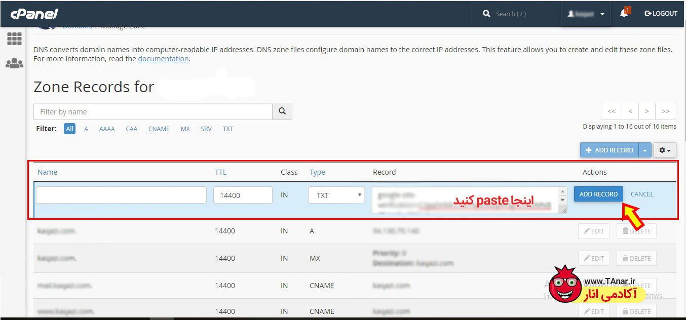 سپس روی گزینه ADD Record کلیک میکنیم تا کار ما در هاست به اتمام برسد.
